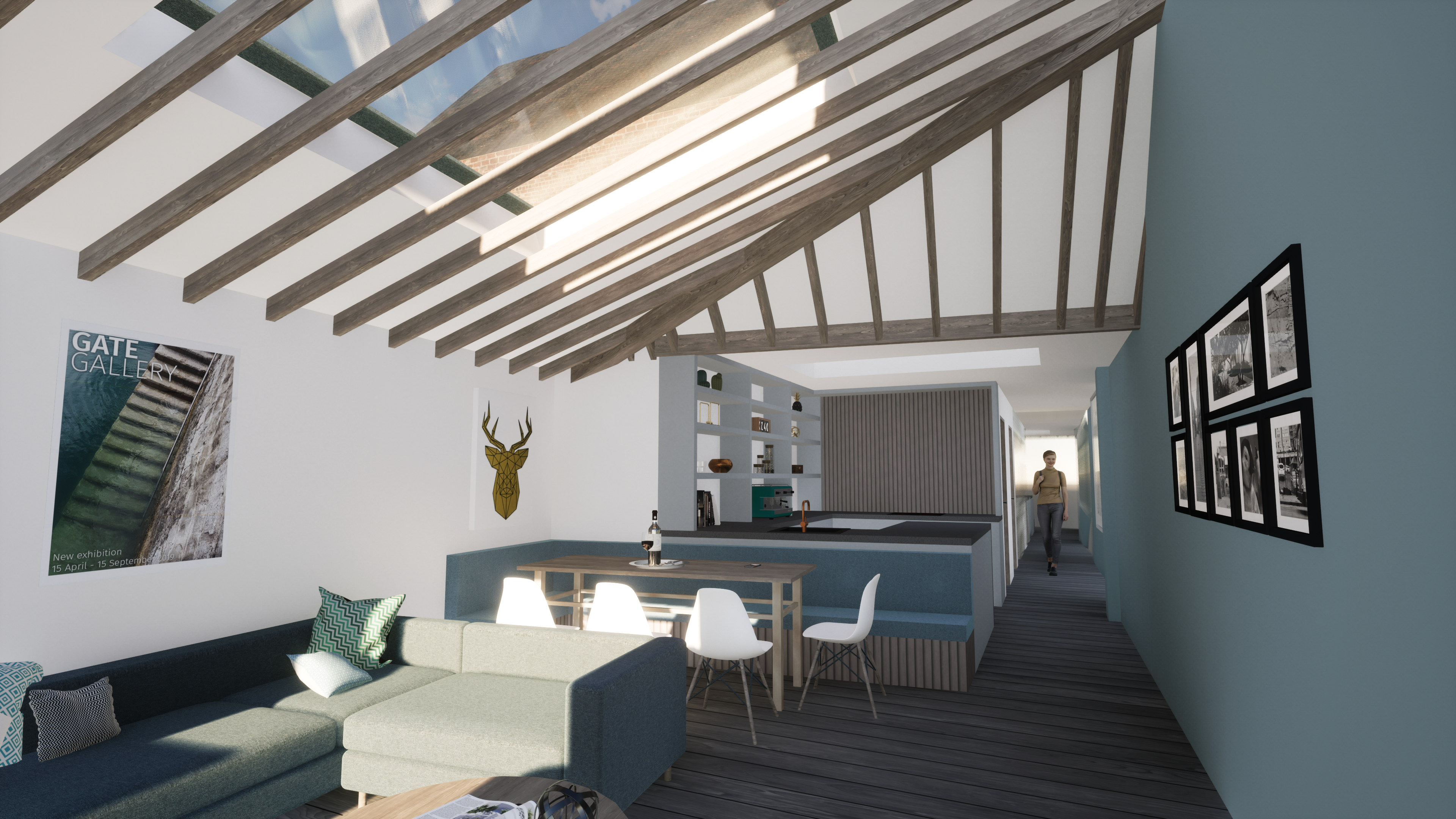 A range of pale blue base and wall units with laminate worktops incorporating a resin sink unit with mixer tap, tiled splashbacks. Breakfast bar with space under for stools, electric hob with extractor over, integrated oven, space and plumbing for a washing machine or dishwasher, fridge freezer space. Pine floorboards, exposed wall beams and a window to the west overlooking the garden.