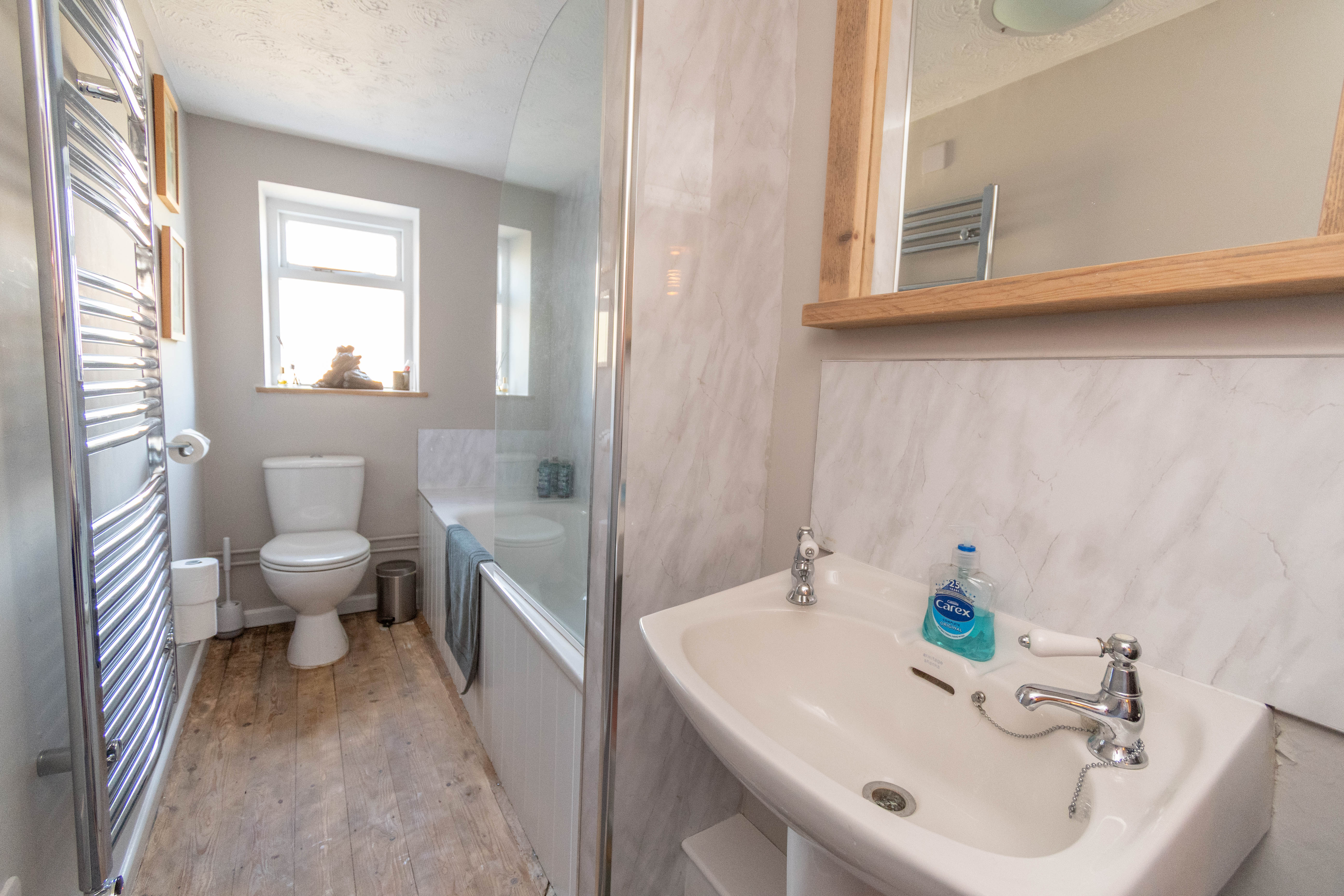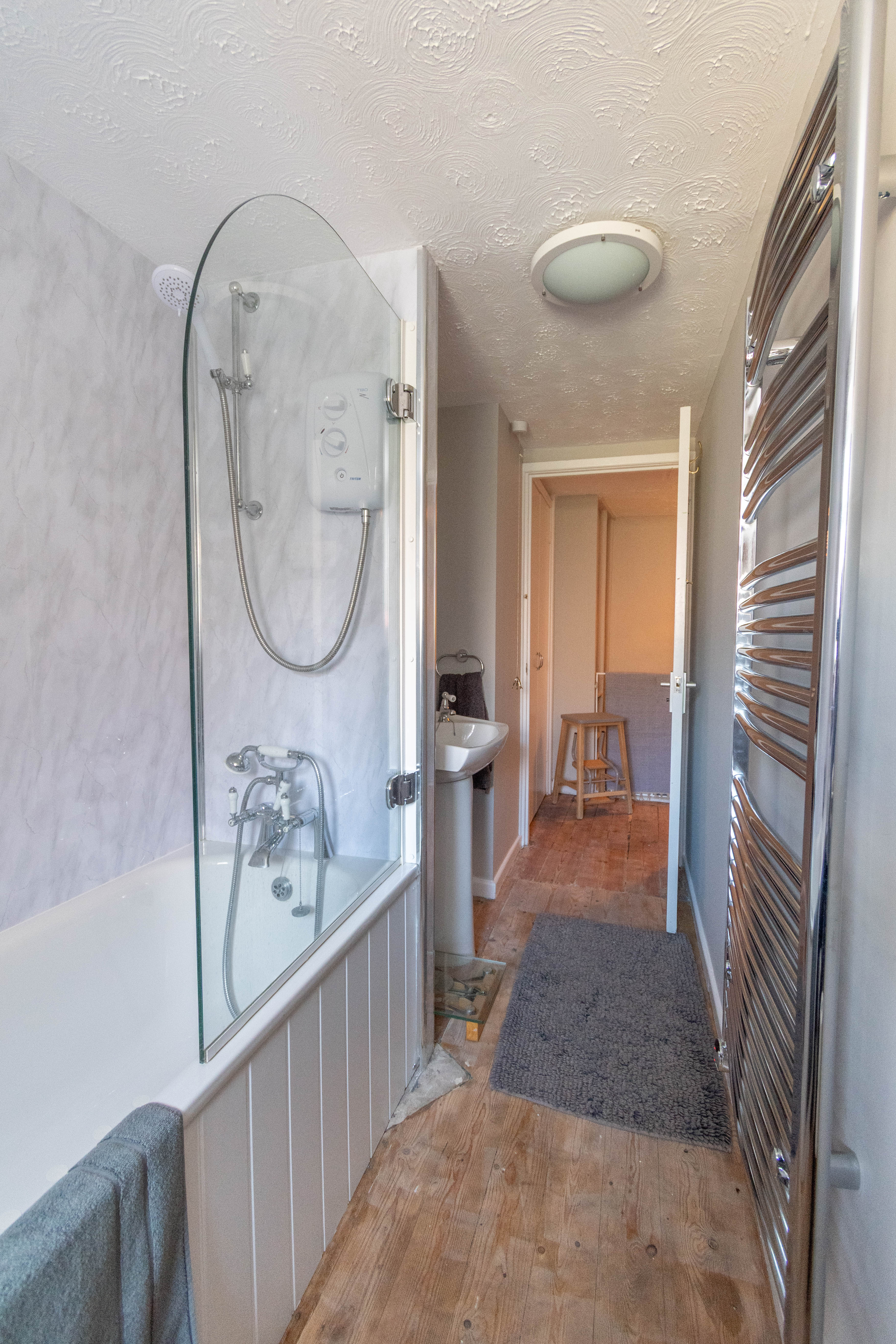 Suite comprising a panelled bath with electric shower over and glass shower screen, pedestal wash basin and WC. Pine floorboards, chrome towel radiator and an obscured glass window to the west.
