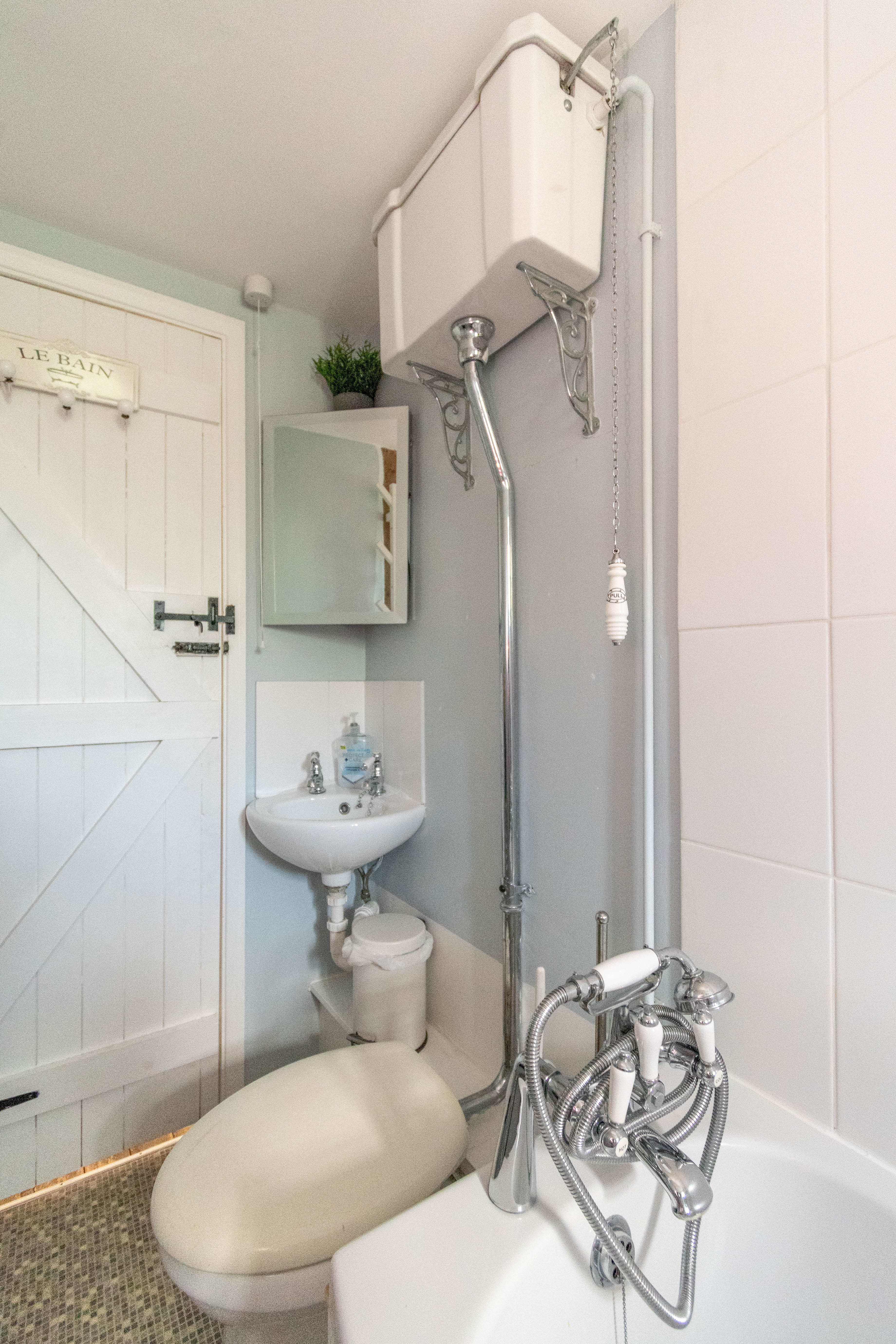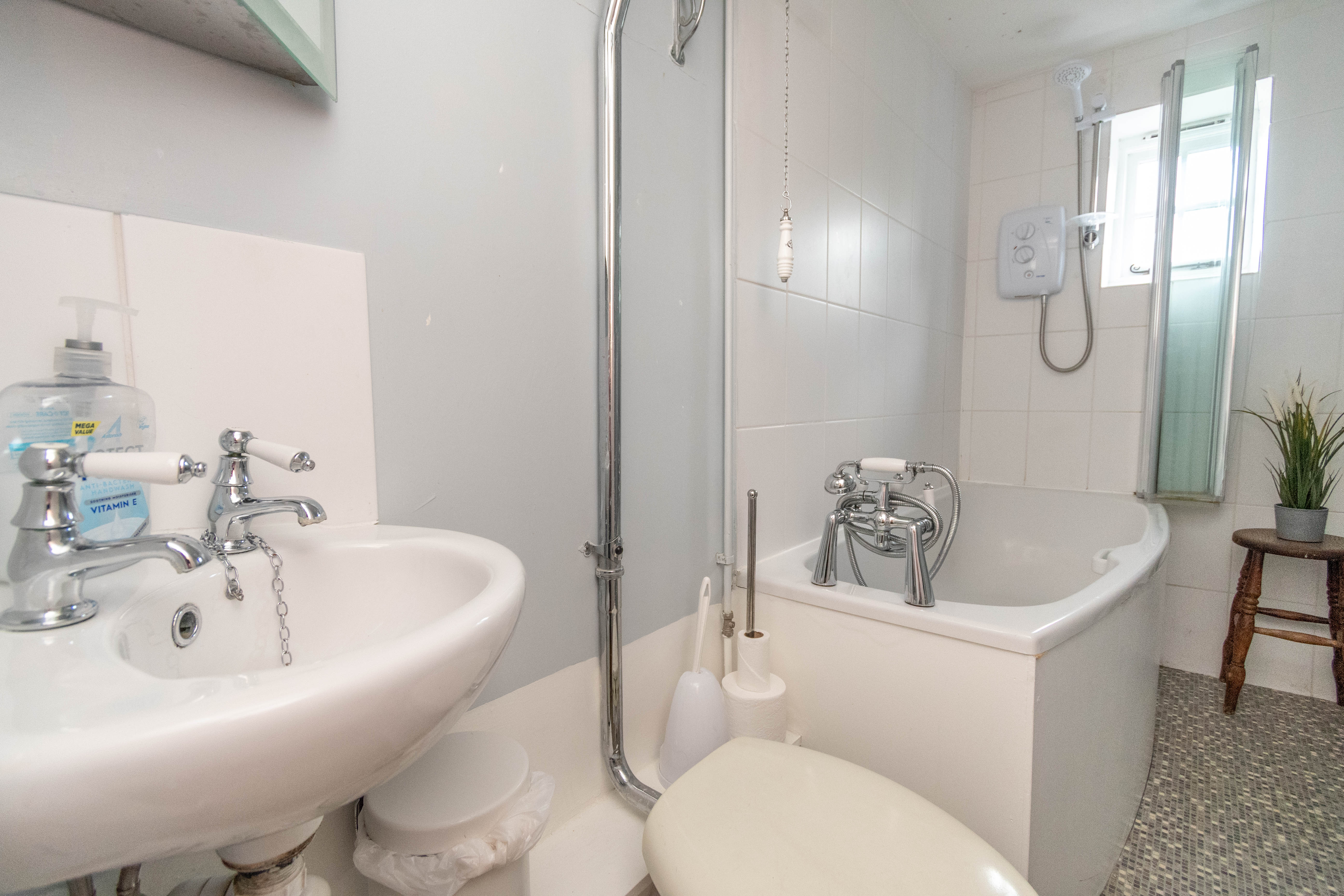 BATHROOMMulti-paned high level window to side, suite comprising panelled bath with electric shower over and folding shower screen, corner wall mounted wash basin and high flush WC, extensive tiling, heated towel rail, exposed wall beams, extractor fan.