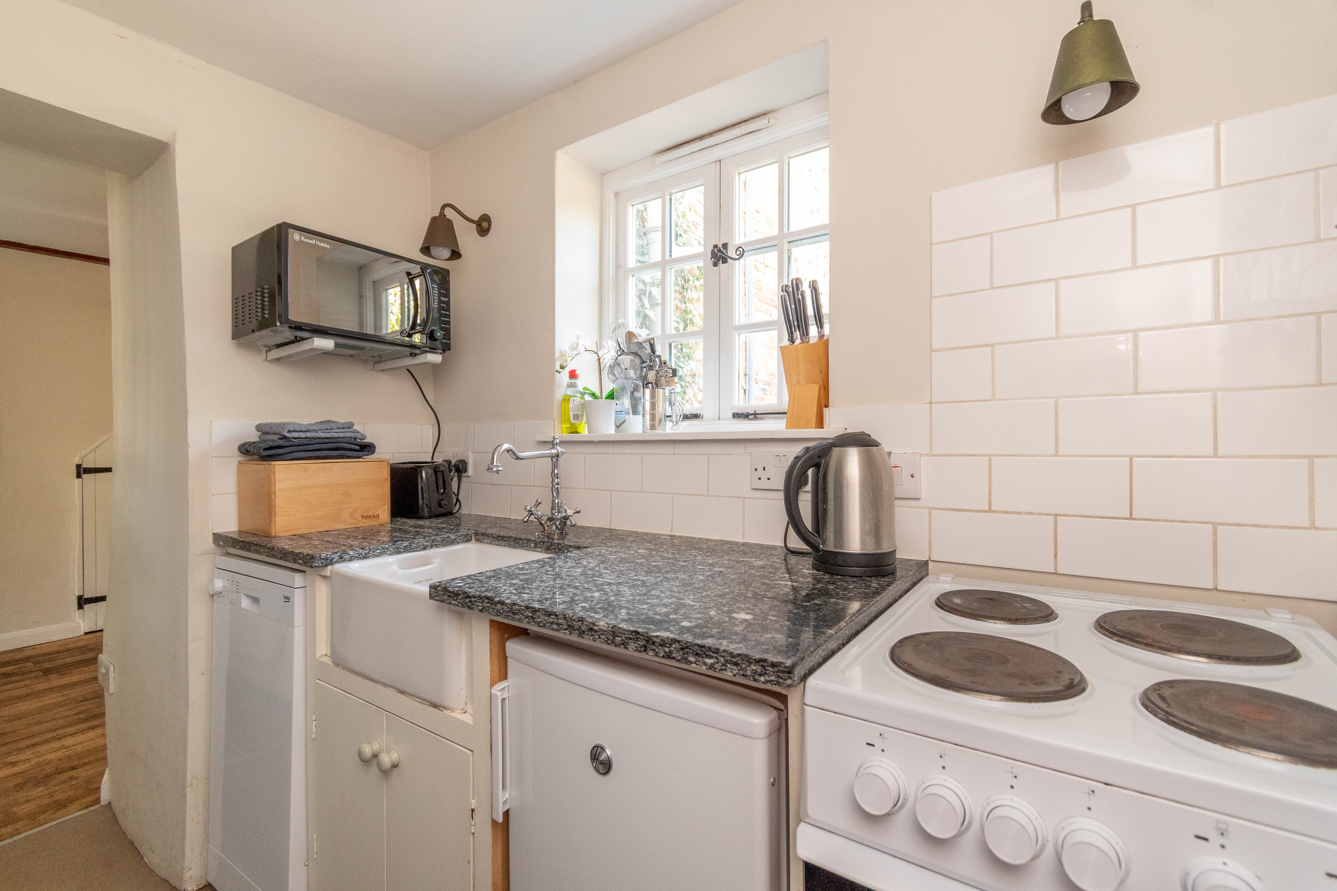 Multi-paned window to rear with pleasant aspect over the garden, door to front, range of floor and wall mounted storage units in hand painted cream finish, granite worksurfaces with inset butler sink unit and swivel mixer tap, splashback tiling, recess and point for electric cooker, recess for under worksurface fridge, recess and plumbing for automatic dishwasher, wall mounted electric radiator, 3 wall light points, extractor fan.
