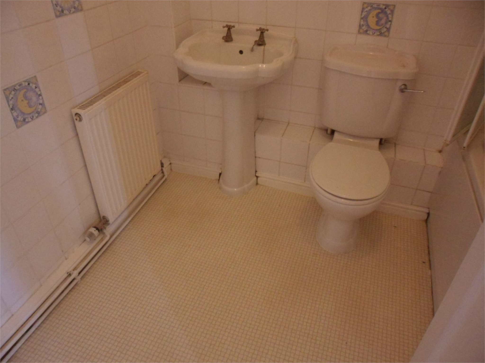 CLOAKROOMTile effect vinyl flooring, radiator, window to front, low level WC, pedestal wash hand basin.