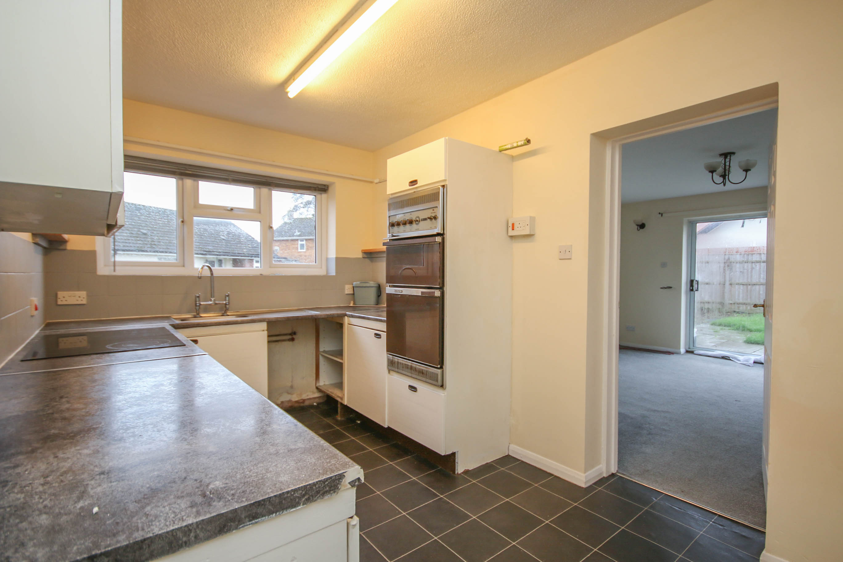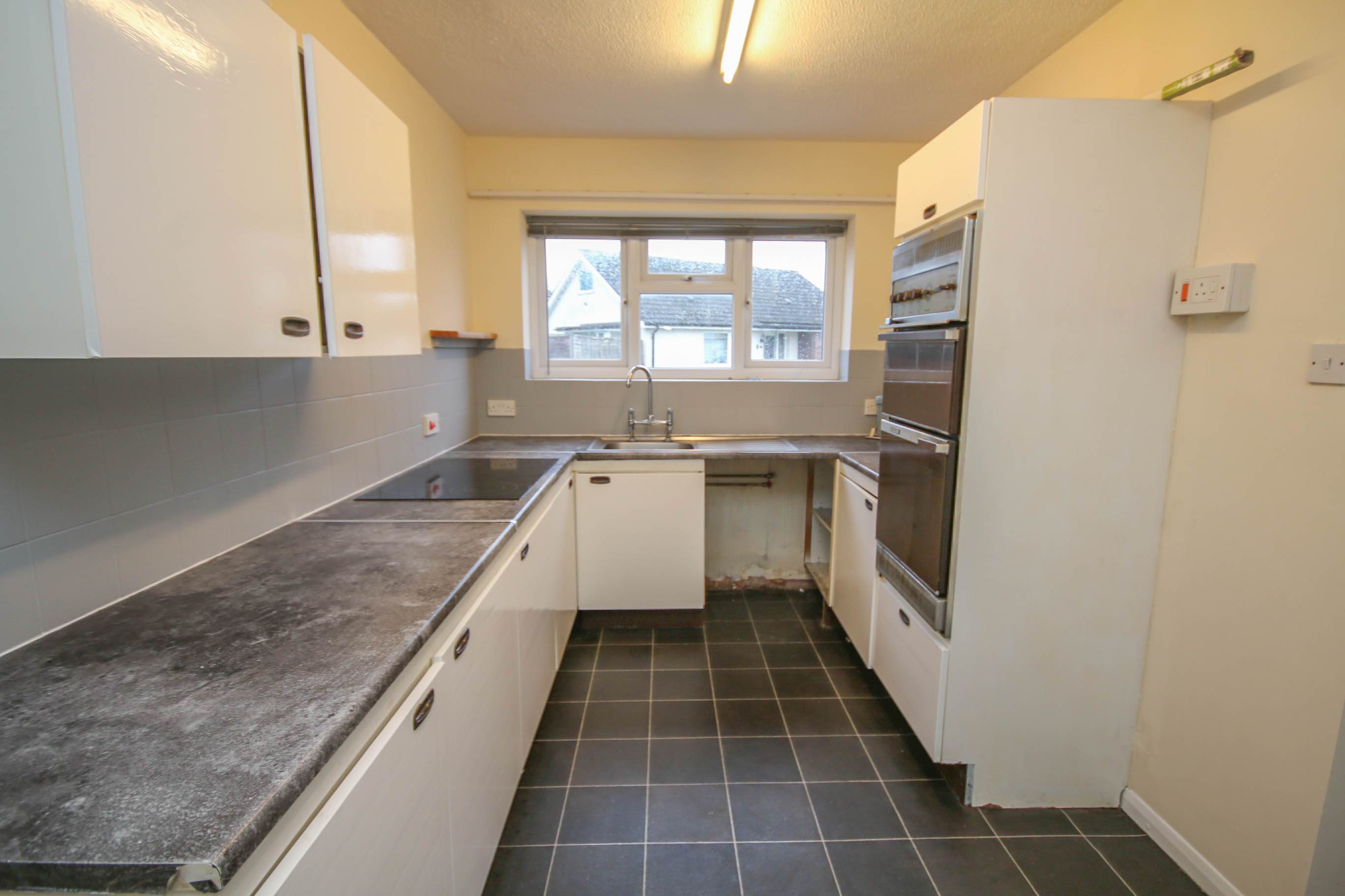 KITCHENA range of wall and base units with worktops over, built in electric oven and grill and built in hob. Stainless steel sink and drainer with mixer tap, plumbing and space for automatic washing machine, space for fridge/freezer, storage cupboard housing gas fired central heating boiler, radiator, window to front, vinyl flooring.