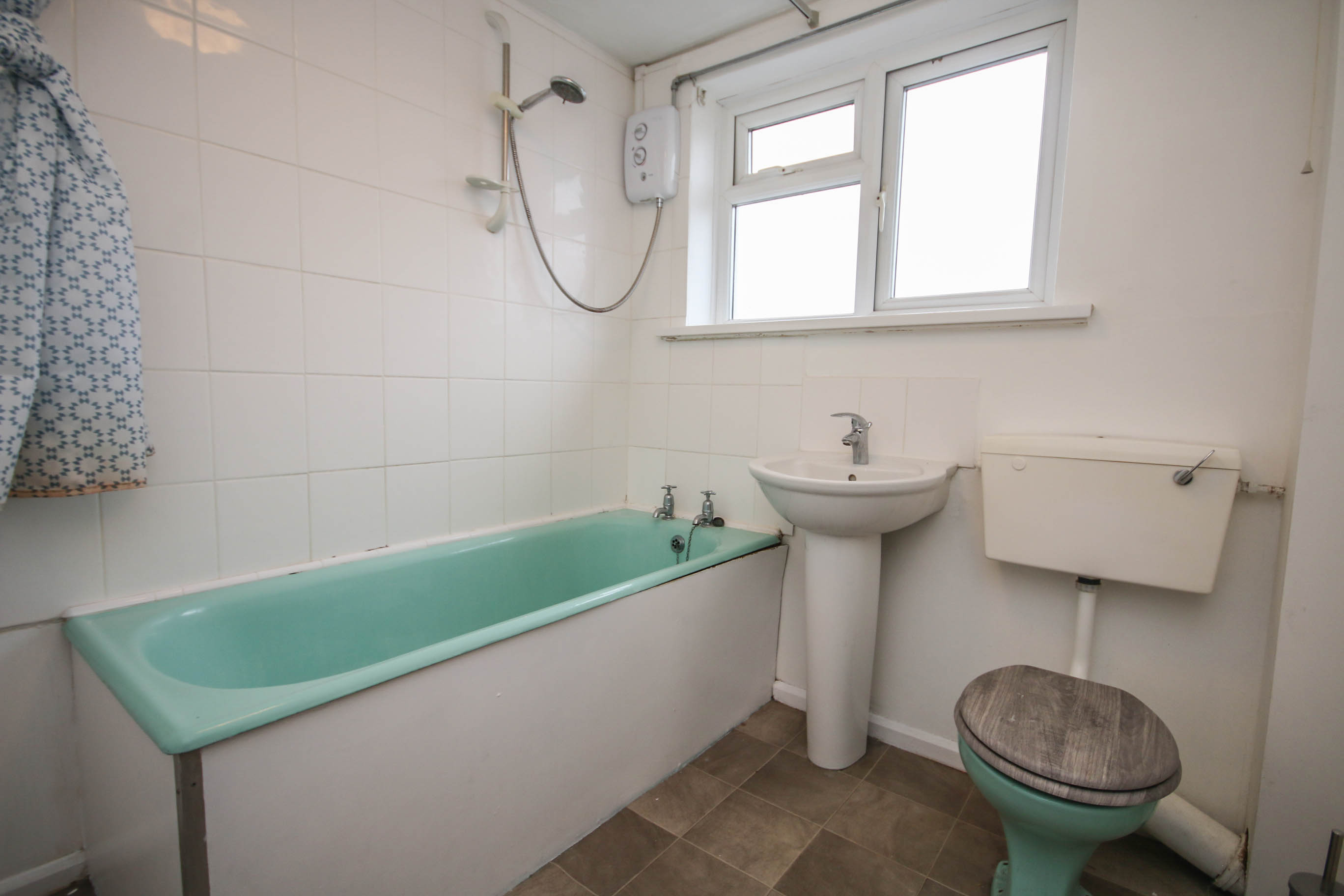 BATHROOMPanelled bath with electric shower over, low level WC, pedestal wash hand basin, radiator, window to front and vinyl flooring.
