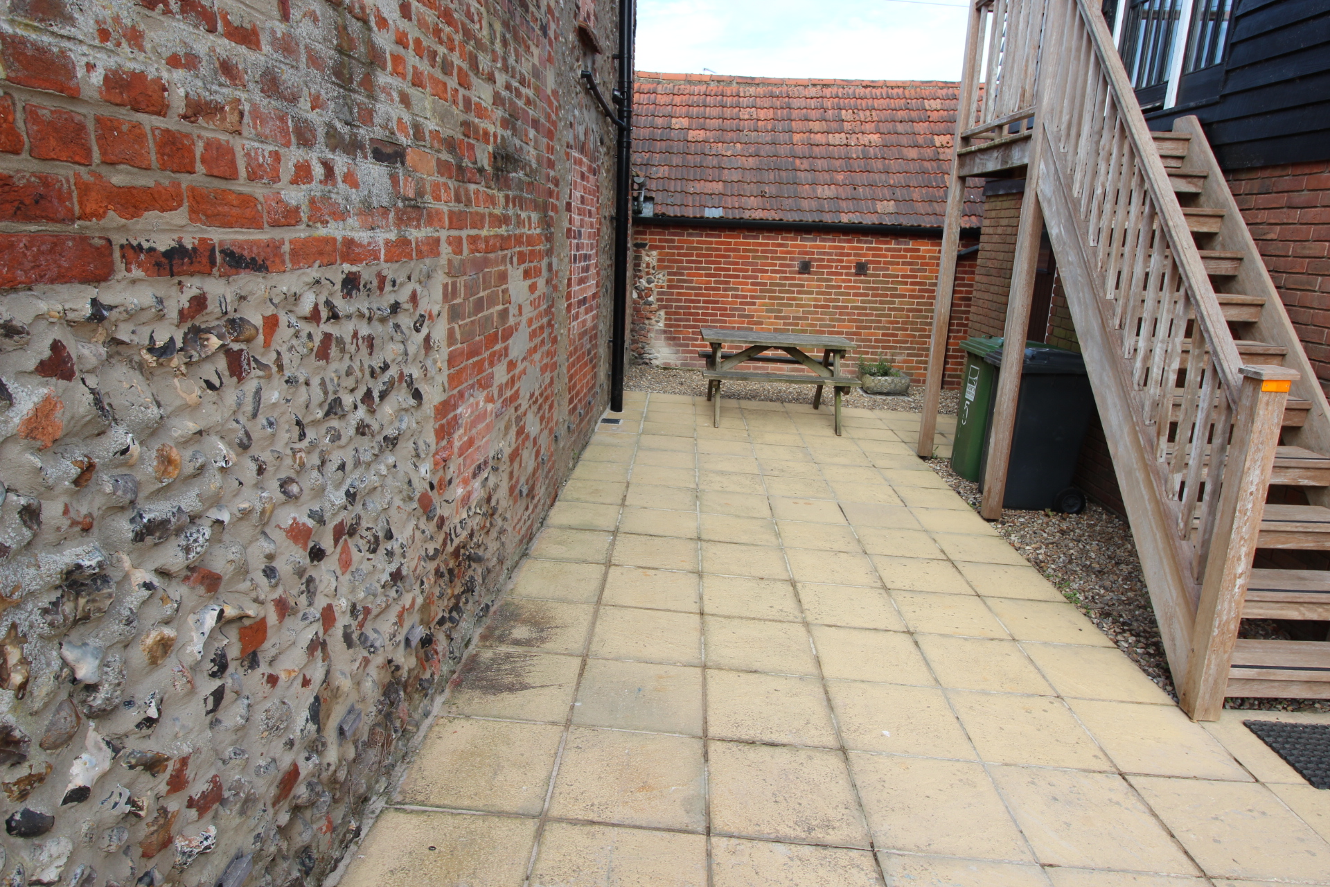 OUTSIDE5 Cadamys Yard is set back from the yard behind a gravelled parking space. There is a small patio area to the side with room for a table and chairs and BBQ etc and a paved walkway leading to the staircase at the side of the building up to the apartment.