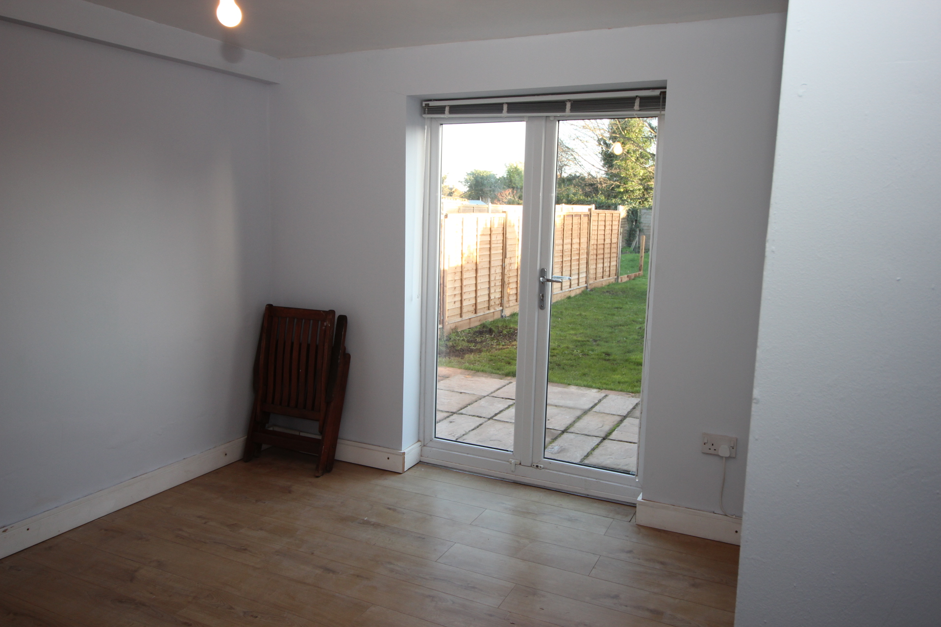 Wood effect laminate flooring, electric heater, patio doors leading to garden.