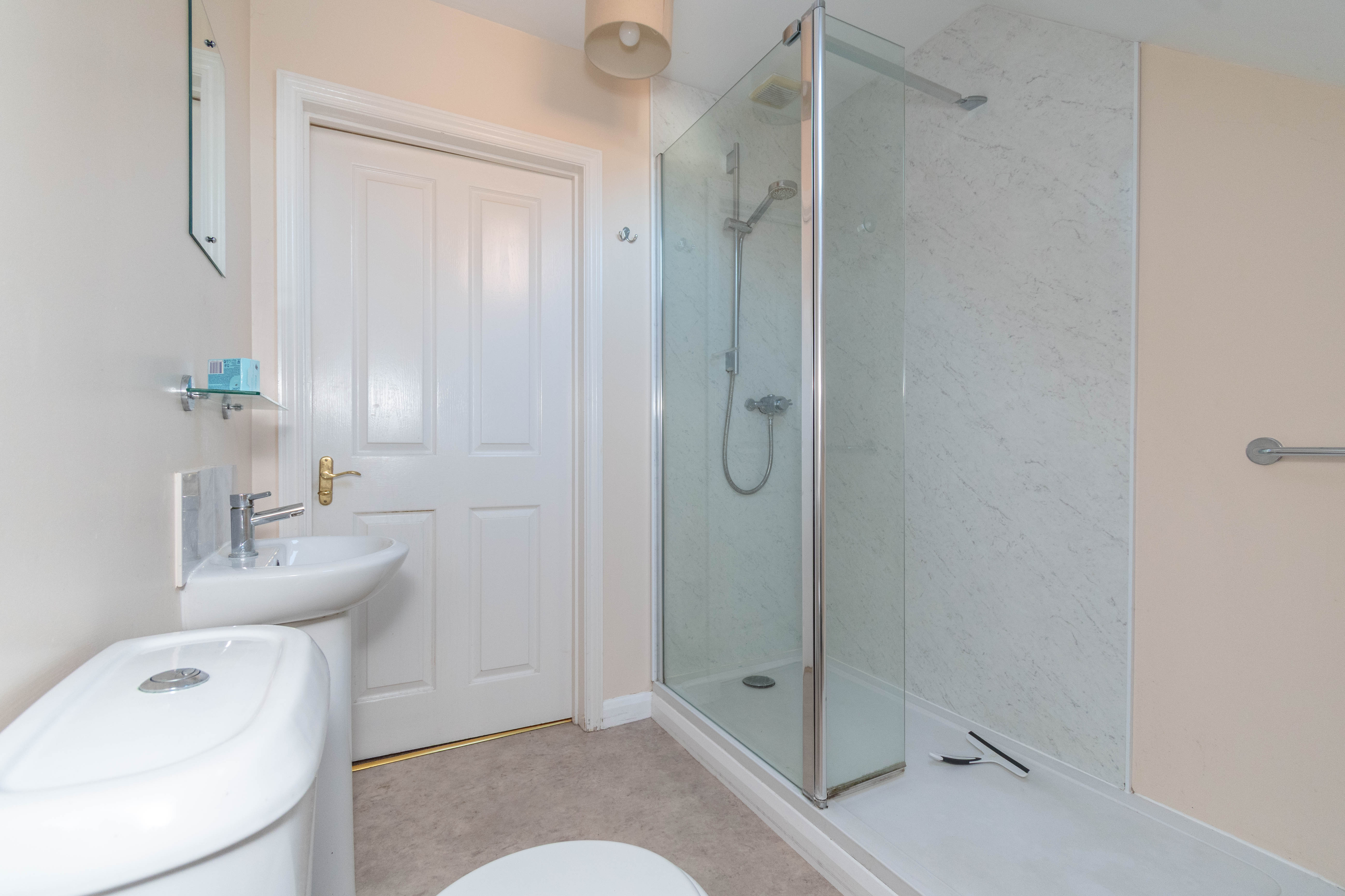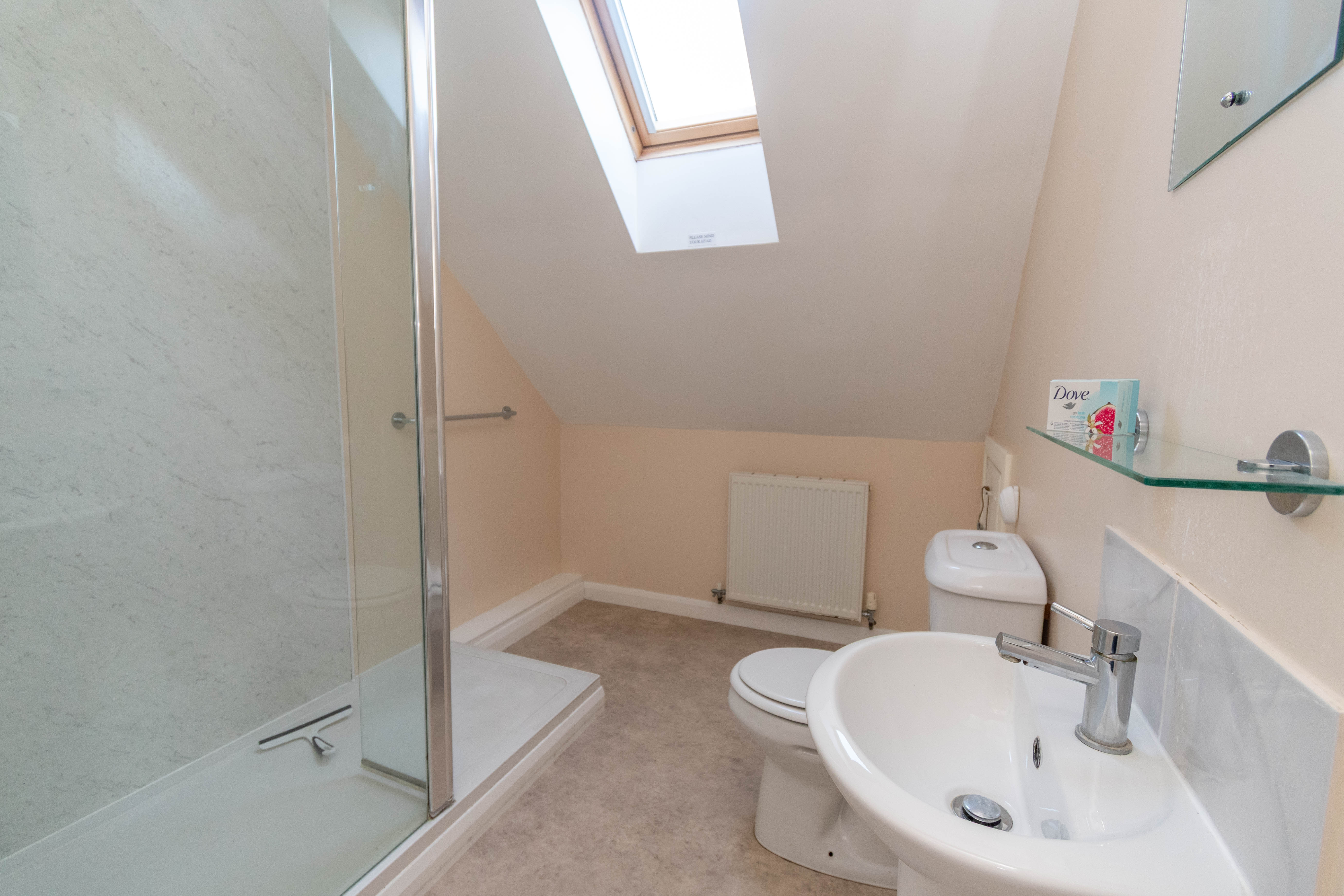 A suite comprising a shower cubicle with a chrome mixer shower, pedestal wash basin with tiled splashback, WC. Vinyl flooring, radiator, extractor fan and a Velux window to the side.