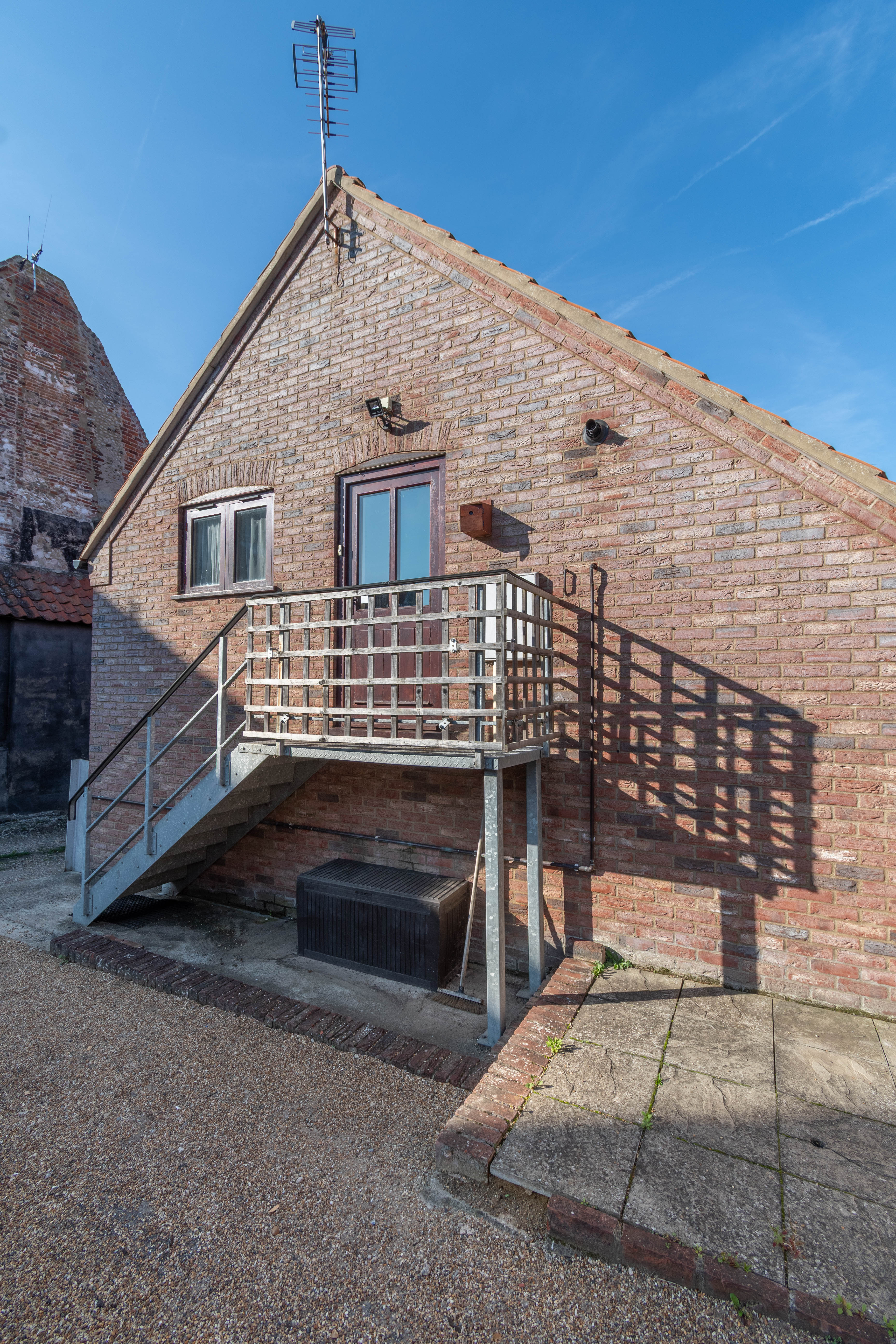 OUTSIDEThe flat is situated on a tucked away yard accessed via a right of way over a shared driveway leading to a gravelled parking space with a patio garden and a metal staircase leading up to the flat.