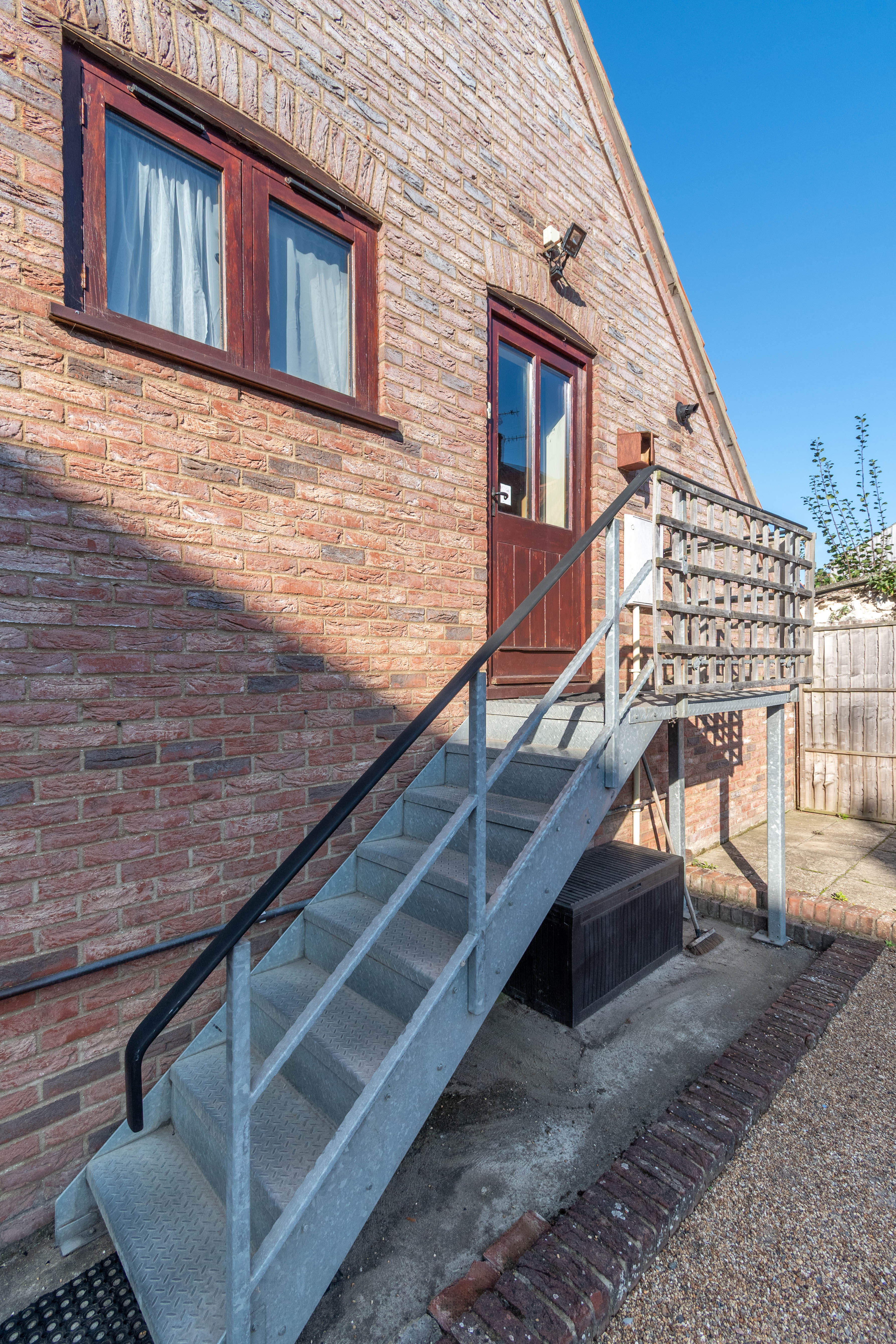 STAIRCASEA metal external staircase leads from the patio garden and parking area up to the first floor. Partly glazed door leading into: