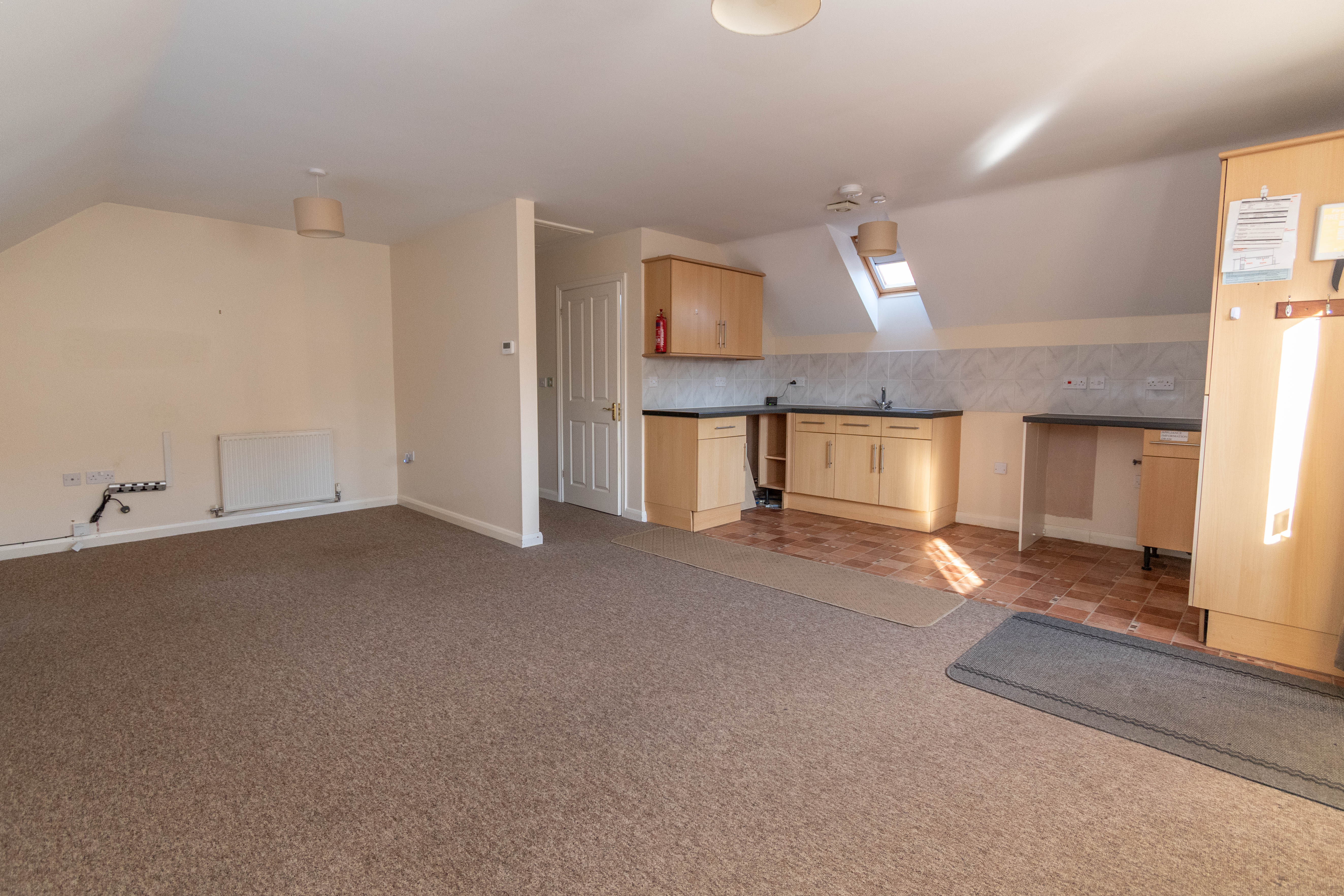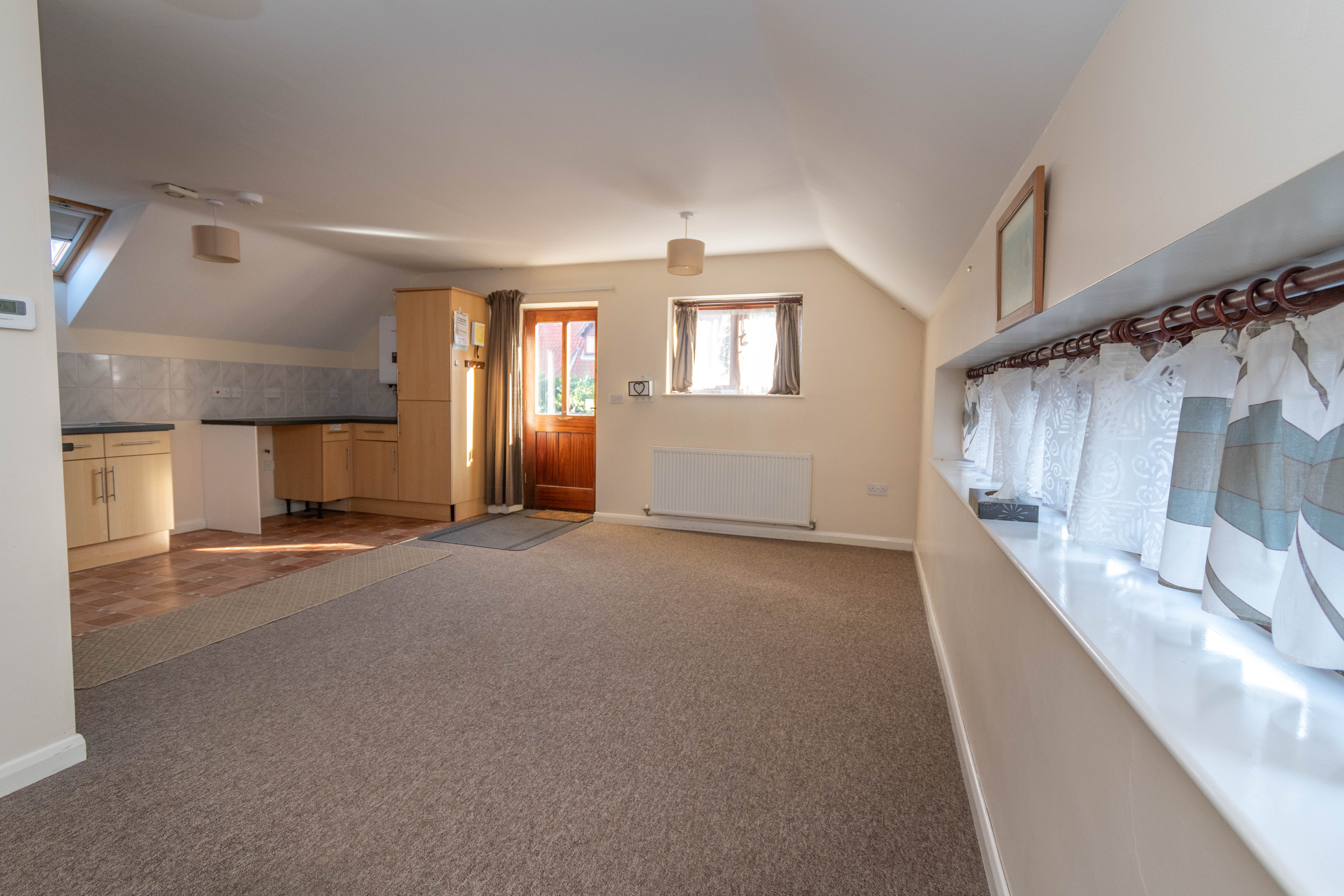 A good sized L-shaped open plan kitchen/dining/living room with windows to the rear and sides. Range of fitted base and wall units with laminate worktops incorporating a sink unit, tiled splashbacks. Spaces and plumbing for white goods, gas-fired boiler providing heating and hot water, 2 radiators and an opening to: