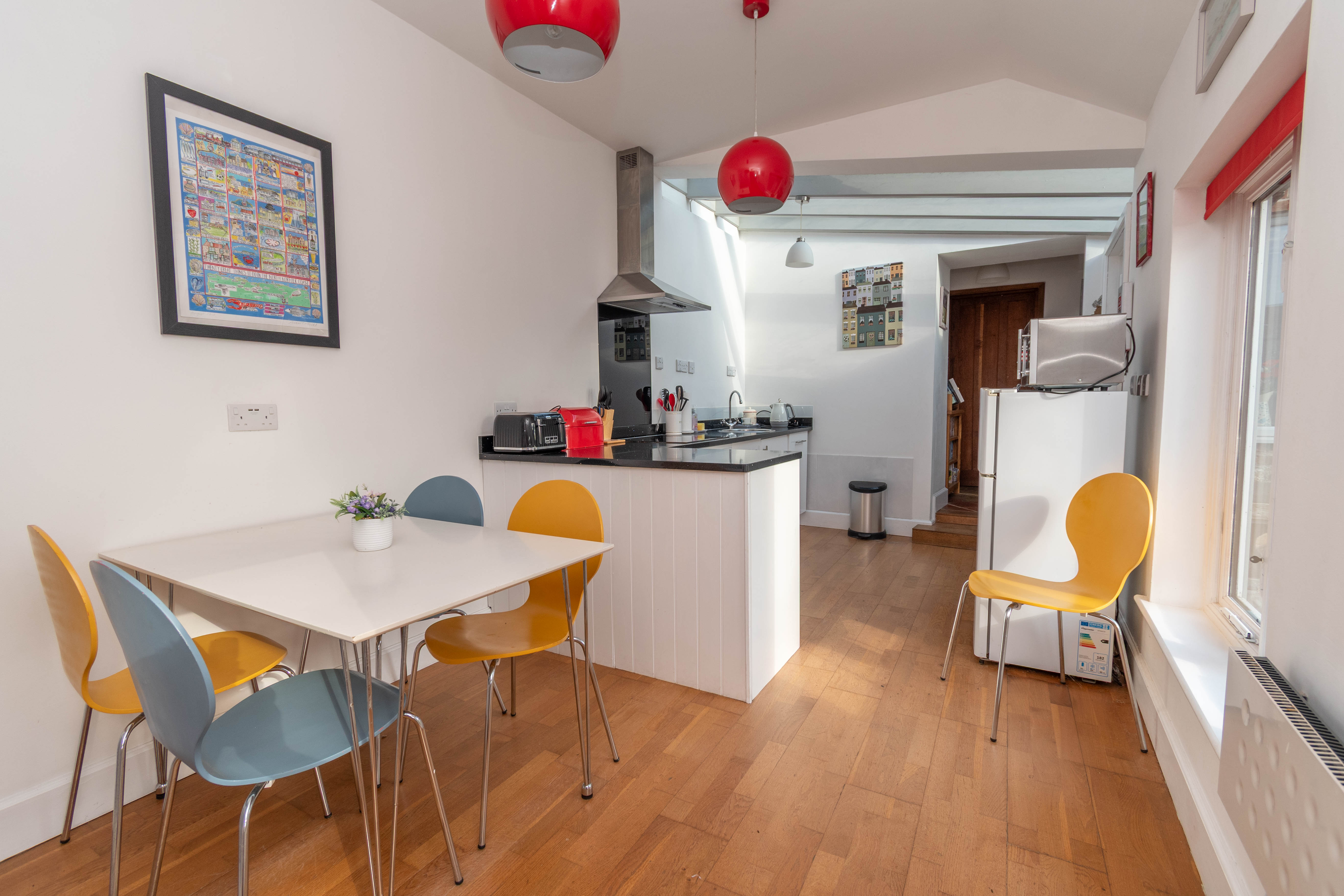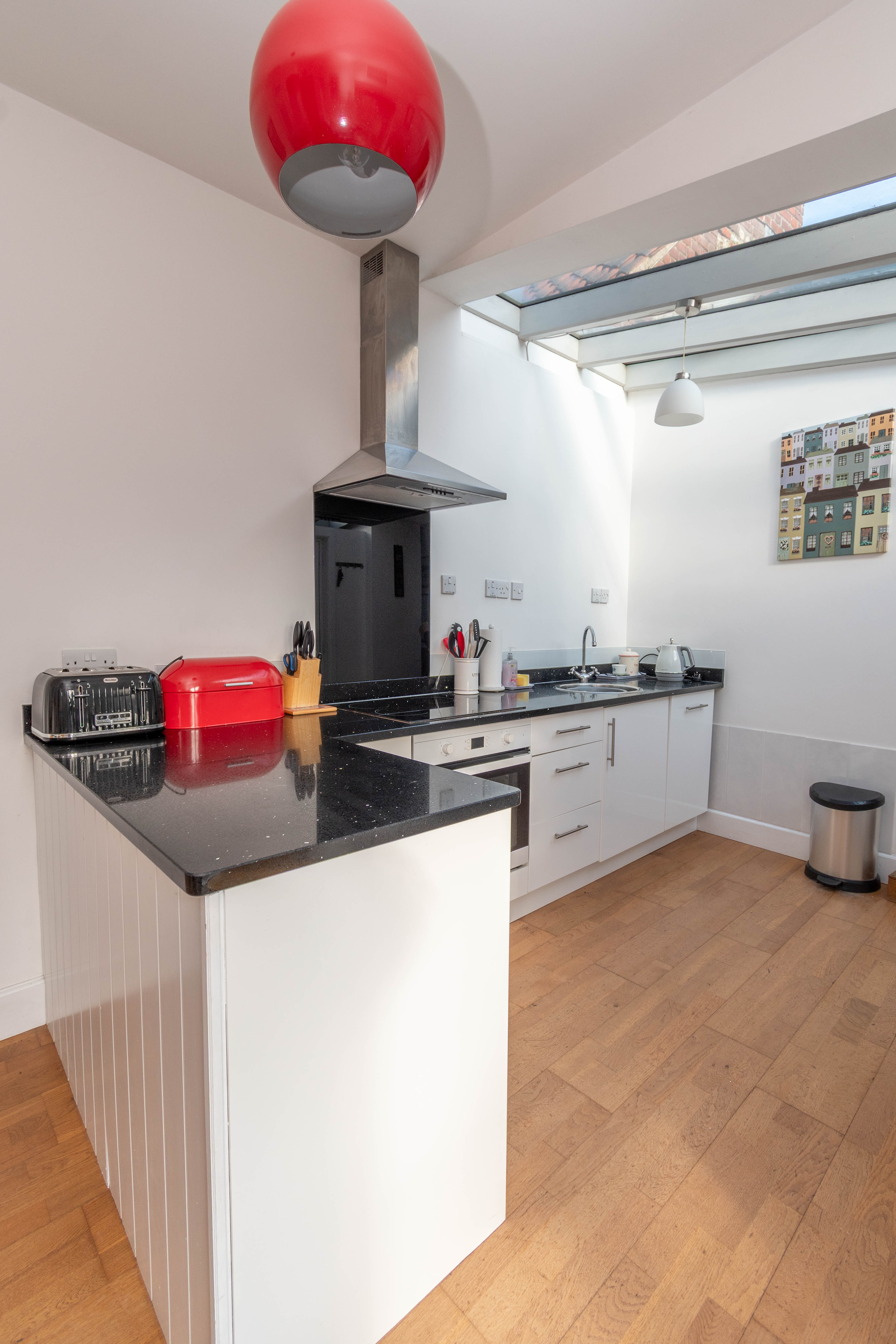 Engineered oak flooring, electric radiator and 2 west facing windows overlooking the courtyard garden.