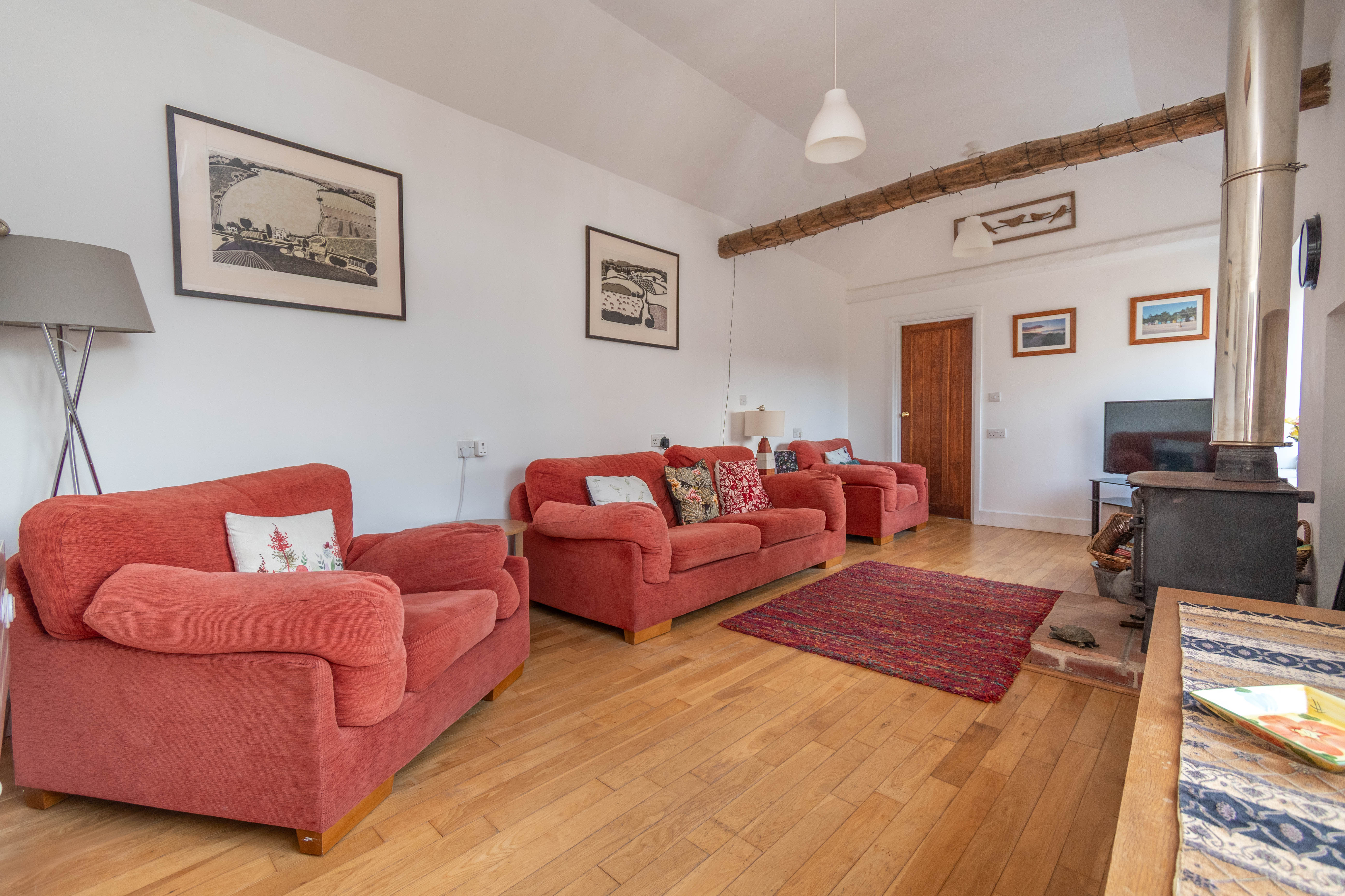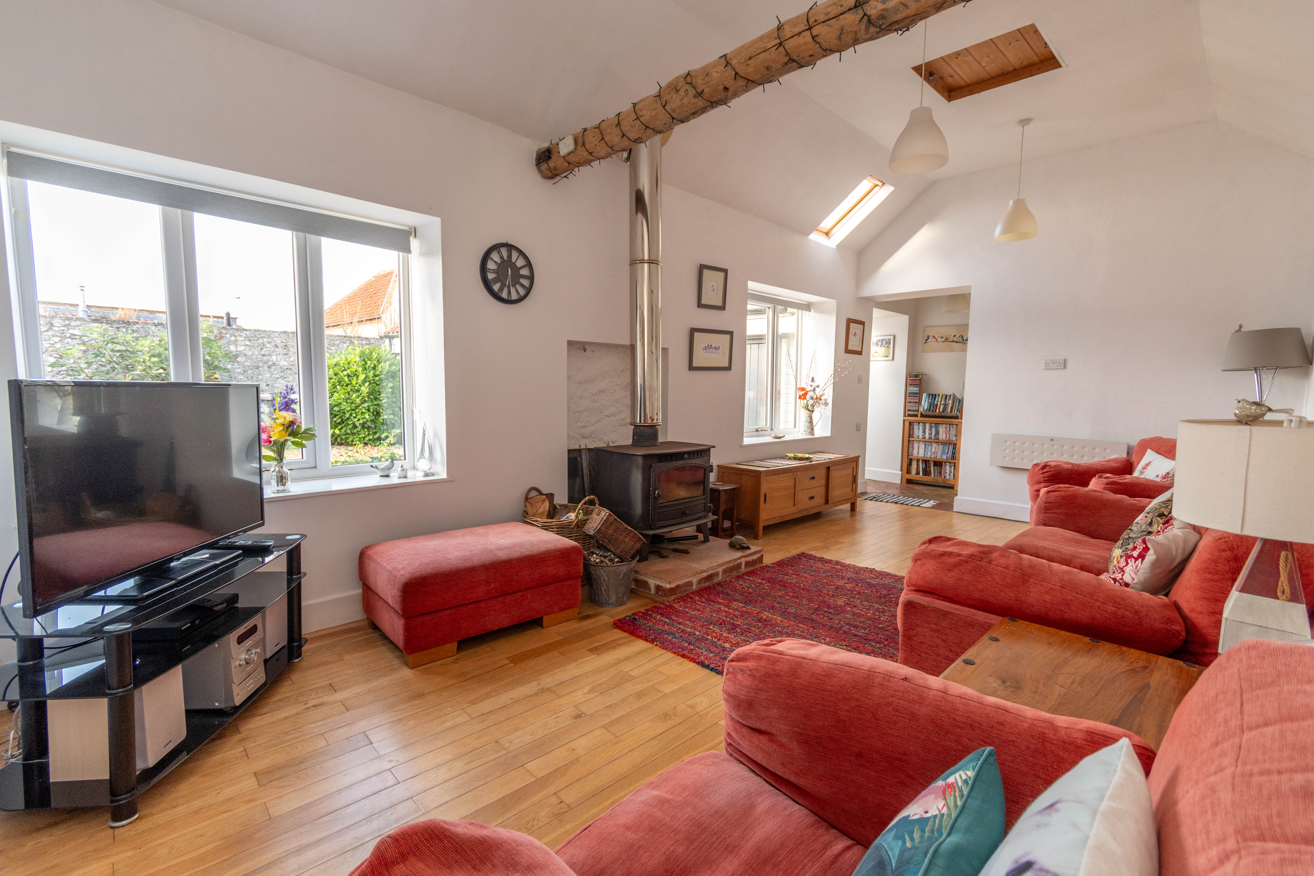 Impressive bright and airy sitting room with a vaulted ceiling with exposed beams, 2 windows overlooking the courtyard and a Velux window. Cast iron wood burning stove with an exposed flue on on a raised pamment tiled hearth, electric radiator, solid oak flooring, 2 hatches to the loft space and a door to bedroom 1.