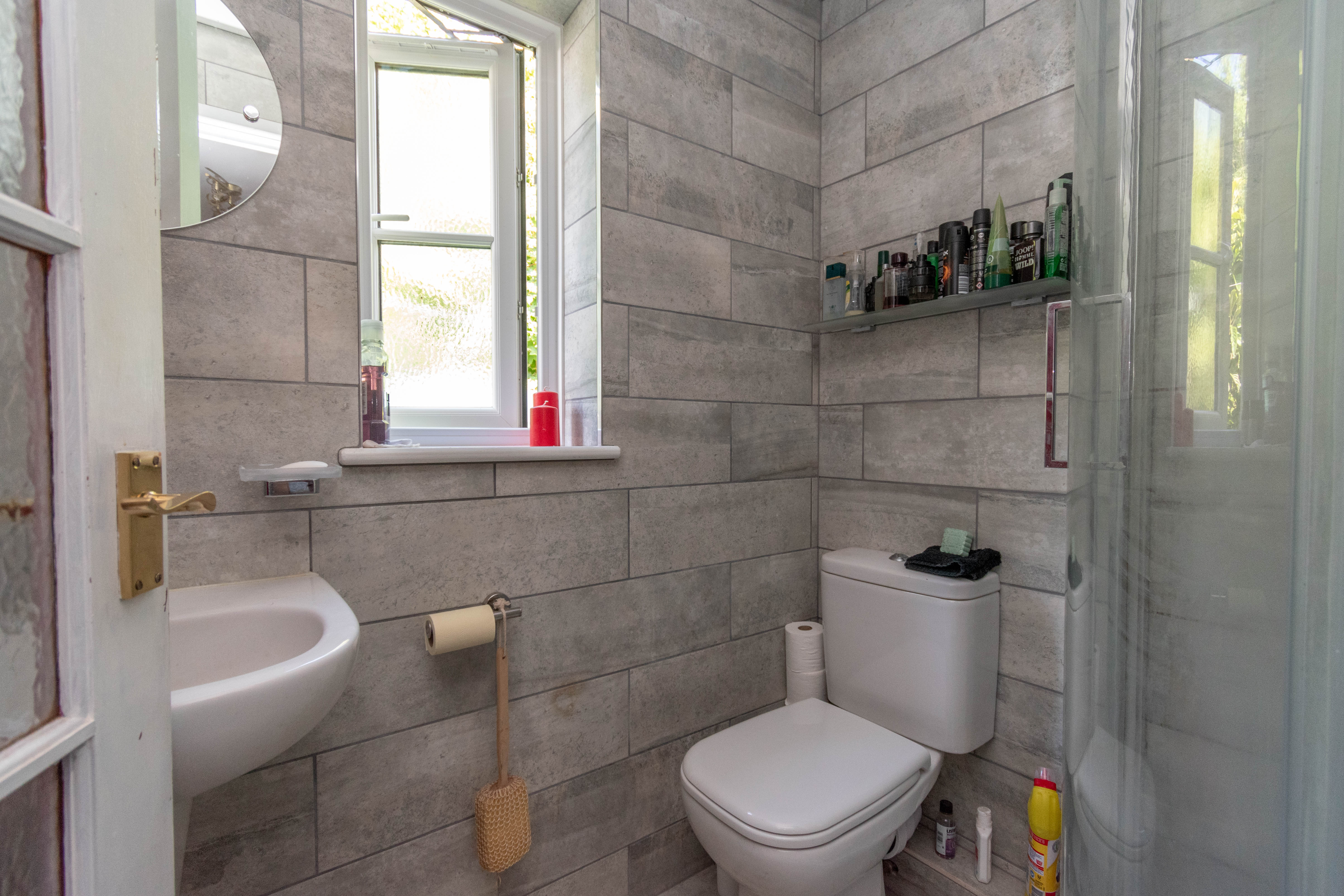 Shower cubicle with an electric shower, wash basin with tiled splashback, shaver point and light, WC. Chrome towel radiator, ceramic tiled floor and a window to the rear with obscured glass.