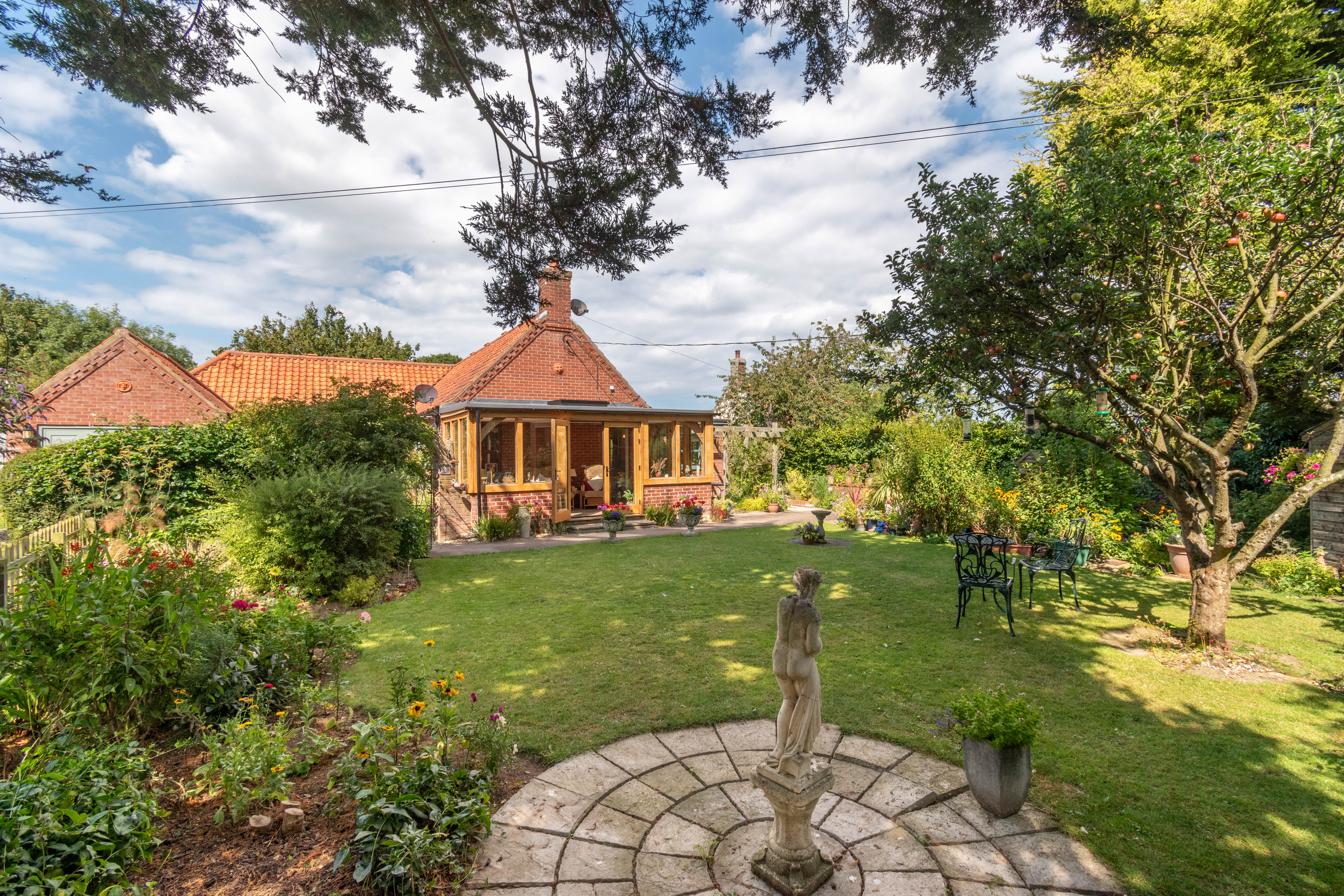Spacious detached 4 bedroom bungalow, oak garden room, south facing gardens and garage in coastal village.