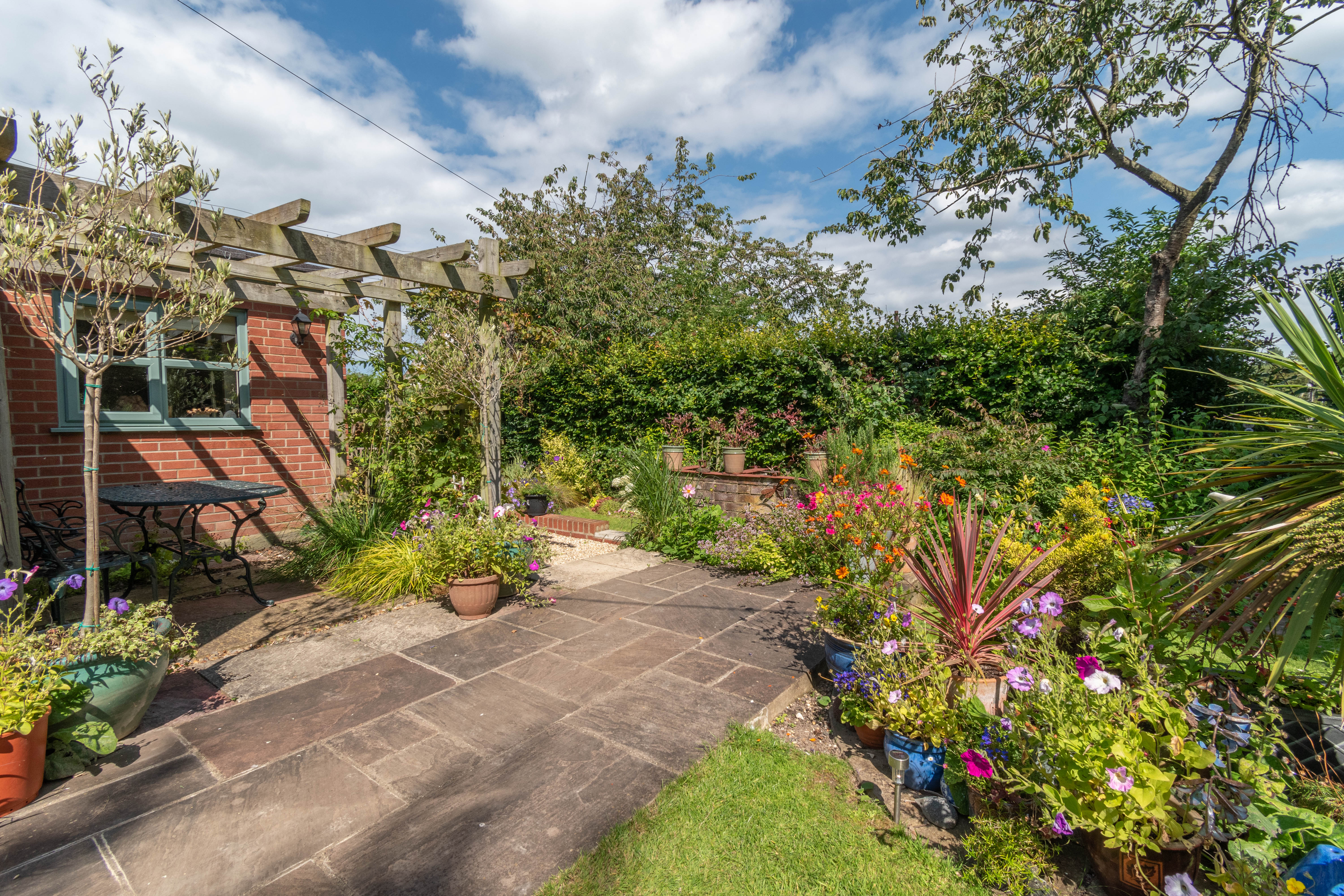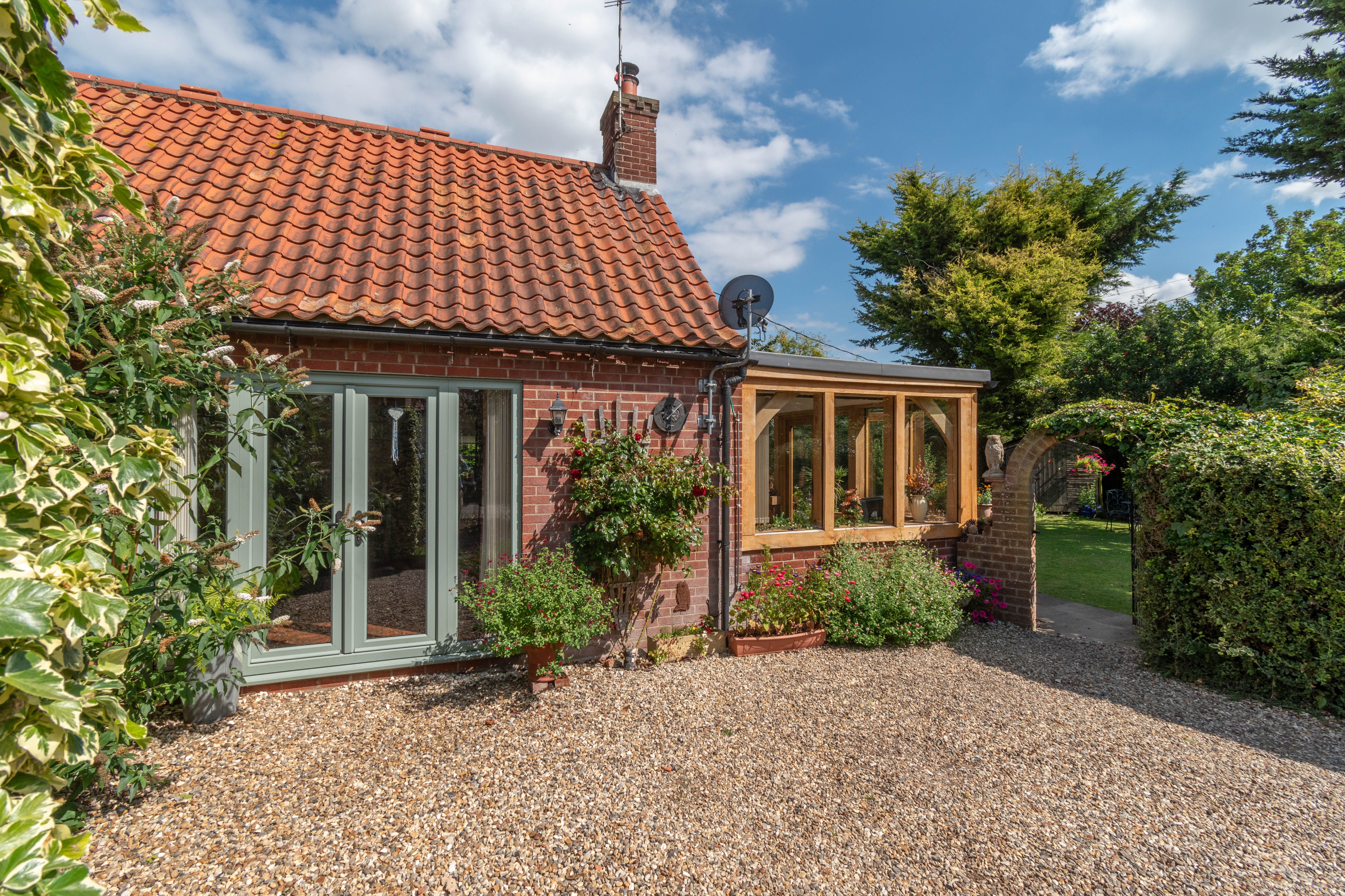 To the front of the property, there is an attractive south facing gravelled courtyard garden with a gated archway leading to the main garden which is at the front of the property, opening out from the oak framed garden room. The garden also faces south and comprises a lawn, mature trees and shrubs, paved patio areas, pergola, shed, outside tap and a brick barbecue. A gravelled pathway leads to an attractively planted lawned side garden with hedged boundaries and a pond. There is also a small lawned garden to the north which backs onto countryside and where there is a greenhouse and the oil storage tank is situated. In all, the gardens and grounds amount to approximately 1/5 acre (subject to survey).