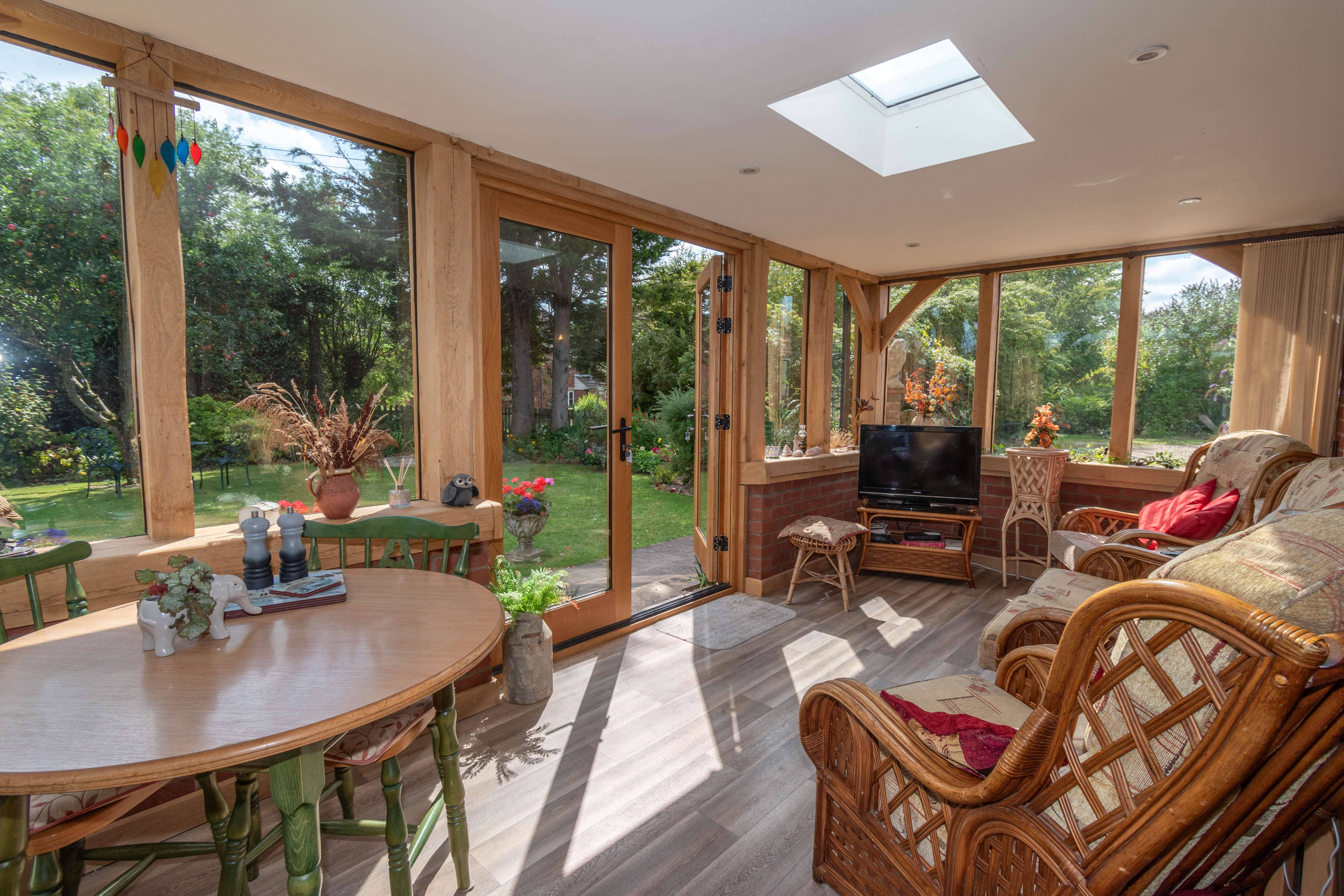 Oak framed garden room which overlooks the garden with double glazed windows on a low brick wall, vinyl flooring, radiator, recessed ceiling lights. Oak French doors leading outside to the garden.