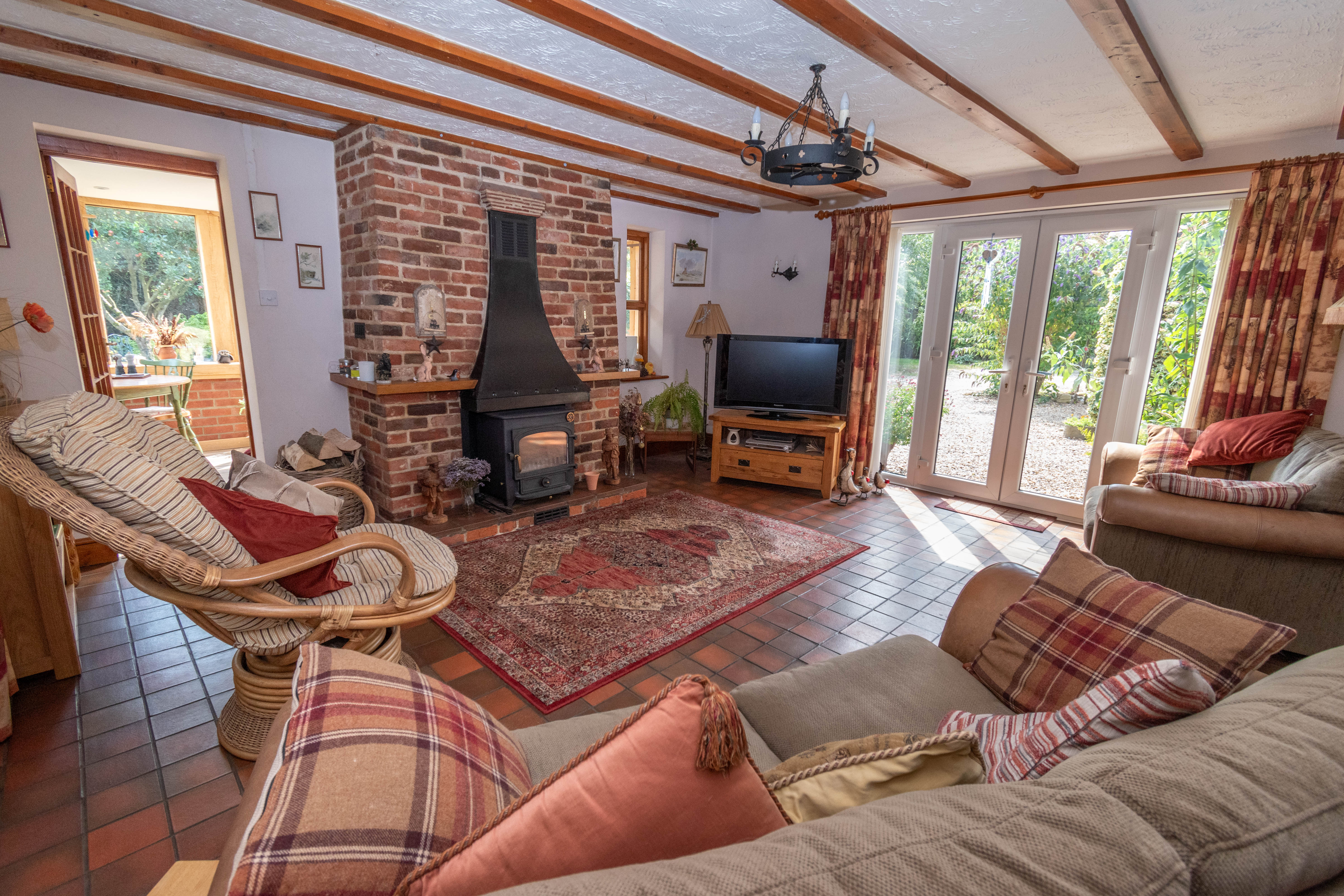 An impressive room with a red brick fireplace housing a Dovre multi-fuel stove on a pamment tiled hearth with timber mantle and black canopy, 2 radiators. Wall lights, exposed ceiling beams and quarry tiled floor. UPVC French doors with fixed side windows leading outside to the front of the property, opening to study/dining room and a small window and glazed door leading into: