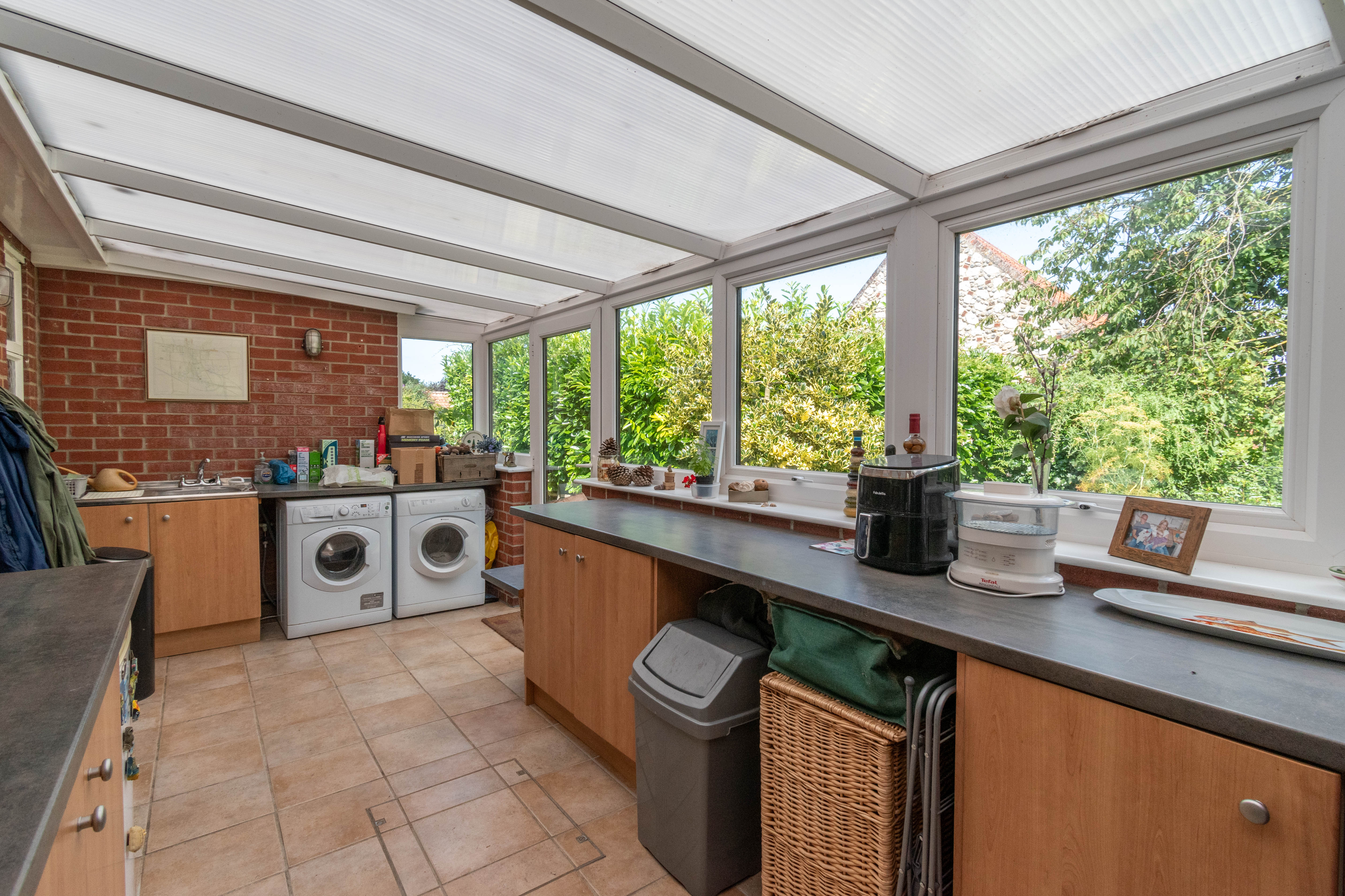 Versatile light and airy room with a full run of windows to the side and a polycarbonate roof. Range of base units with laminate worktops incorporating a stainless steel sink with mixer tap, 2 radiators, spaces and plumbing for a washing machine, tumble dryer and fridge freezer. Ceramic tiled floor, wall lights and a glazed UPVC door leading out to the side of the property.